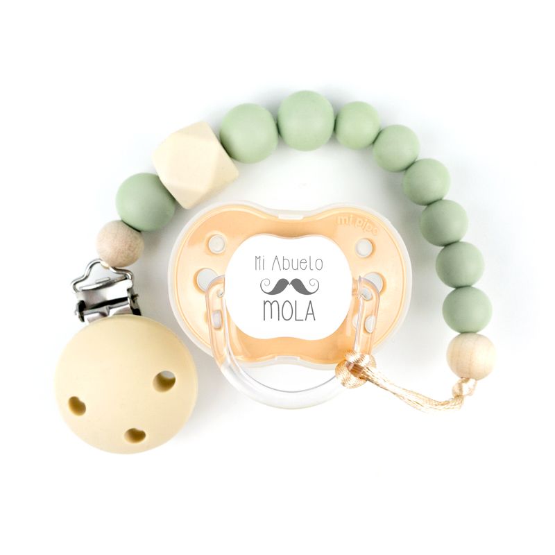 Cajita Chupete Beige Divertido + Cadenita de silicona Gema Verde Soft, texto a elegir