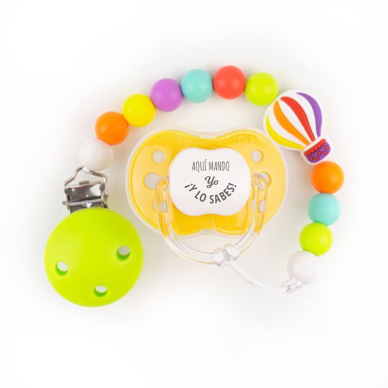 Cajita Chupete Sunset Divertido + Cadenita de silicona Globo Multicolor, texto a elegir