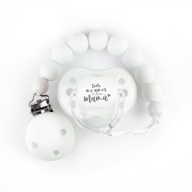 Cajita Chupete Blanco Divertido + Cadenita de silicona Bubble Blanca, texto a elegir