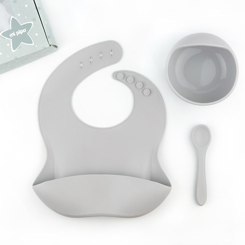 Vajilla con babero, bol y cuchara de silicona Gris